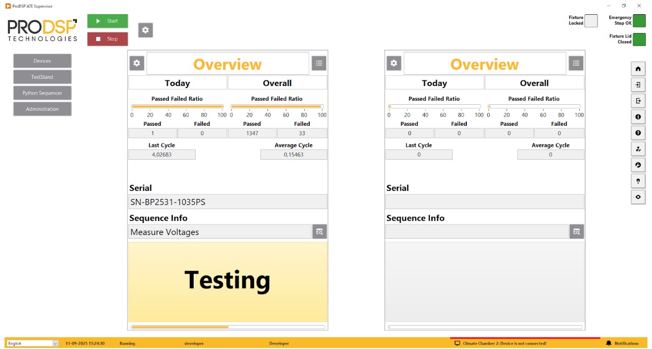 DescriptionThe ProDSP ATE Supervisor software is a ready-to-use solution to configure, control, and monitor your Automated Test Equipment in a user-friendly environment. The software can be adapted to a wide range of test devices: it can be a single-seat manual fixture or a fully autonomous, multi-socket in-line handler. With our solution, you can increase your system flexibility to easily switch between testable DUT product types and variants. It helps to reduce your manufacturing process downtime by monitoring the key process indicators and detecting issues before they become failures. Users can also be notified in case of a required maintenance period. Our test sequence framework (available in Python and NI TestStand) implements the tester control, reporting and monitoring tasks so you can focus on implementing the actual product test sequence. This helps reduce deployment time for our test engineer users. Our solution can be integrated with your ATE in a flexible way. You can choose to handle all your test equipments, MES/ERP and DUT communication within your sequence. Or you have the possibility to integrate all the control tasks in our software with device plug-ins to get a more integrated, clean, and fully controlled solution. With either solution we are providing an API to control the ProDSP ATE Supervisor and access its data. We have a ready-to-use library written in Python and also in LabVIEW (NI TestStand). For the common test equipment control plug-ins are available on request. Features and Benefits